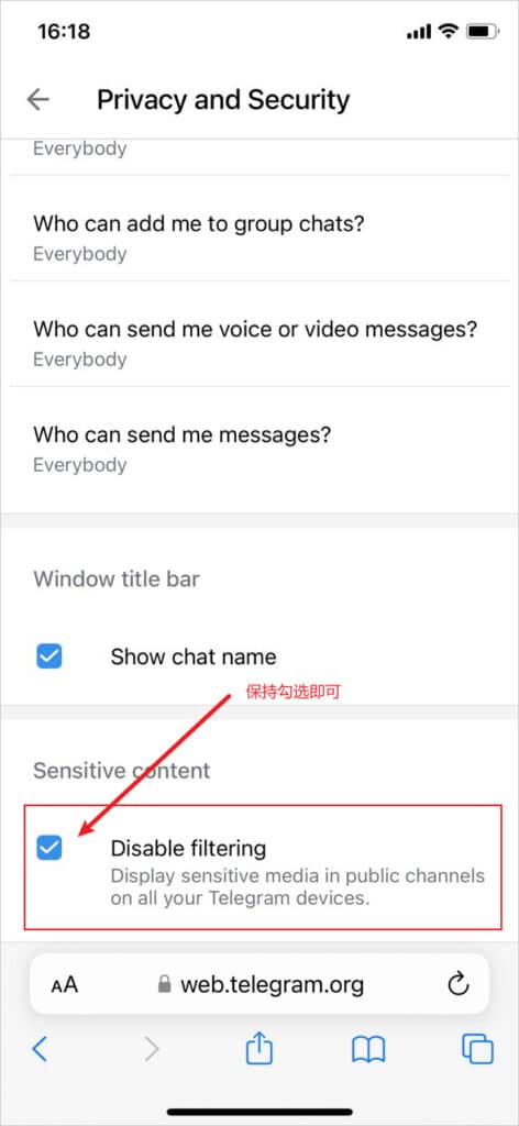 3、在 Sensitive Content 下勾选 Disable filtering 即可停用 Telegram 内容过滤,这样所有被封锁或禁止的 Telegram 频道及 Telegram 群组内容都会被解锁,如下图所示。